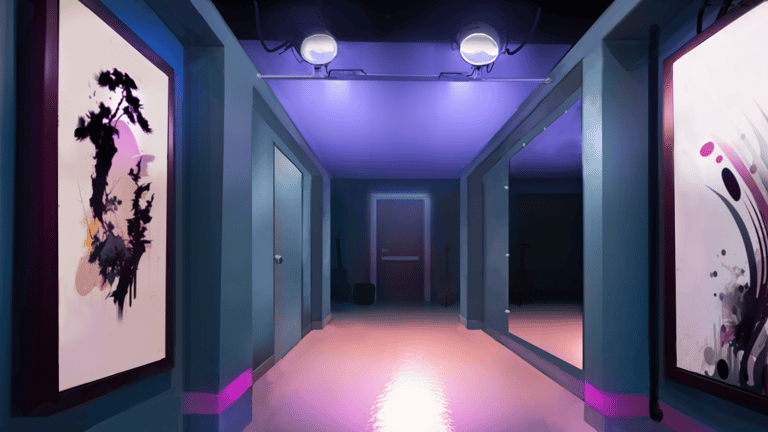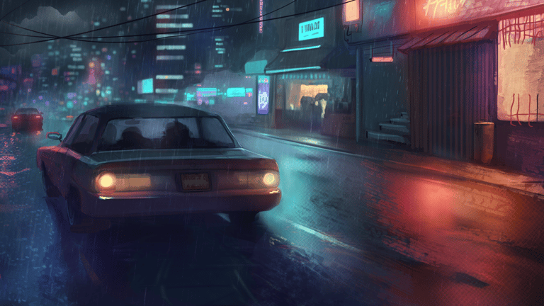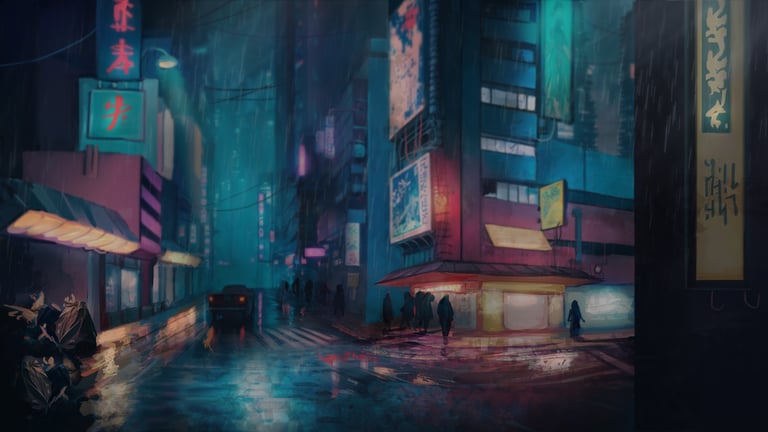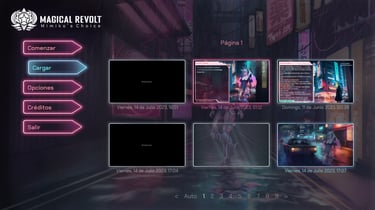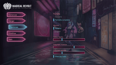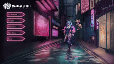 Las ilustraciones de fondos con ambientes fríos y tétricos de temática ciberpunk. La oscuridad y el contraste de luces resaltan la atmósfera futurista.